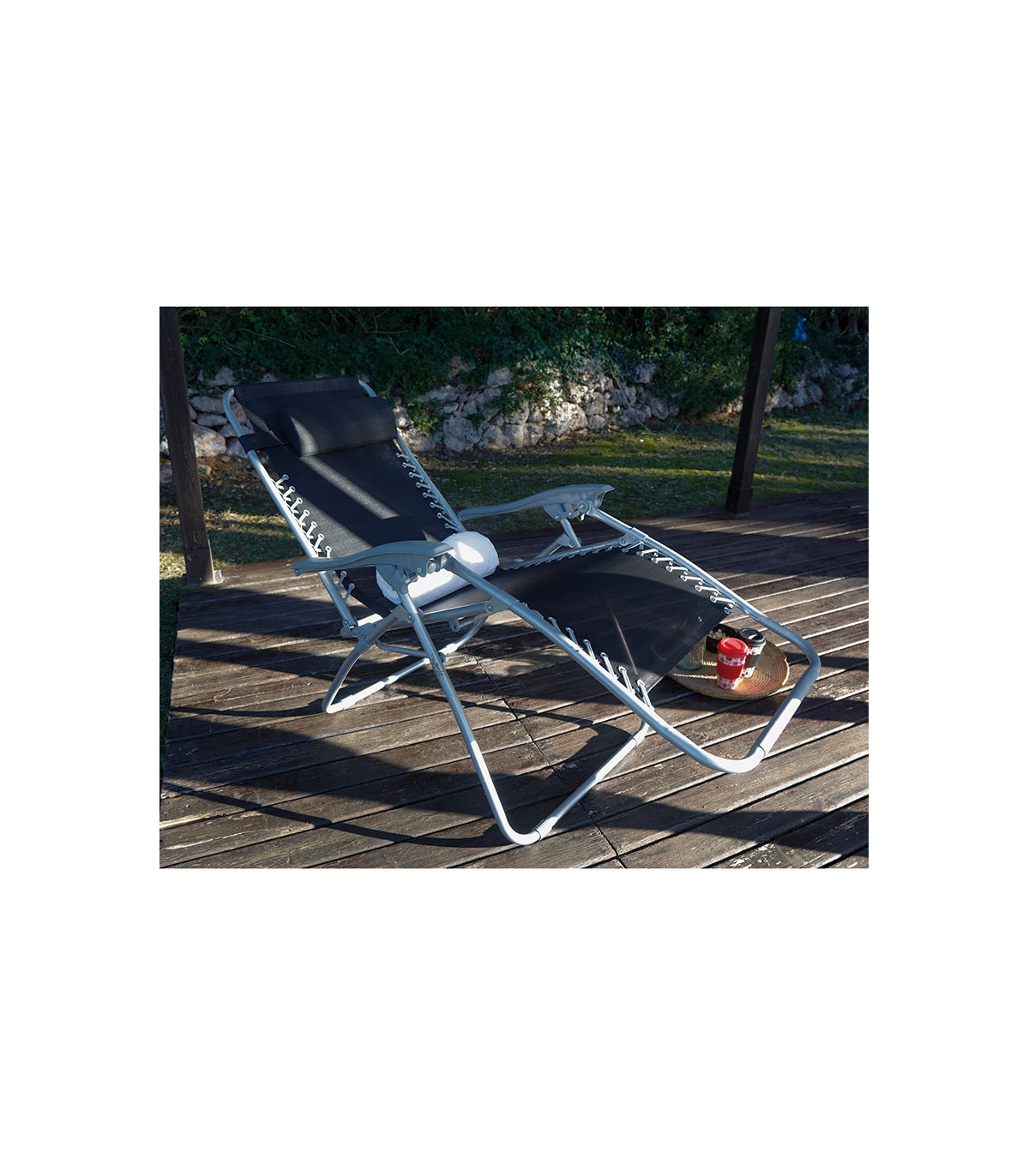 Estructura acero/textilene. Dimensiones: 95x65xh.82/111 cm. Plegado: 65x14xh.95 cm. Altura brazos 66 cm. Altura asiento: 47 cm. Peso máx: 150 kg.