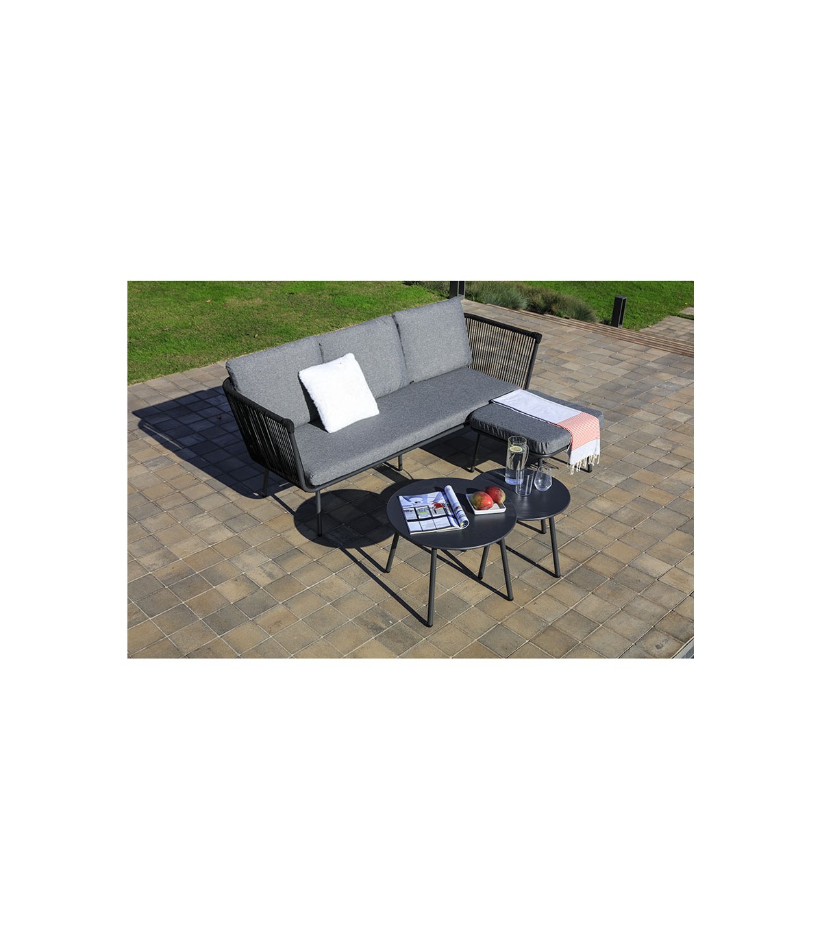 Sofá acero + 2 mesitas + puff. Estructura metálica/cuerda redonda. Cojines de poliéster incluidos. Mesitas superficie imitación madera.