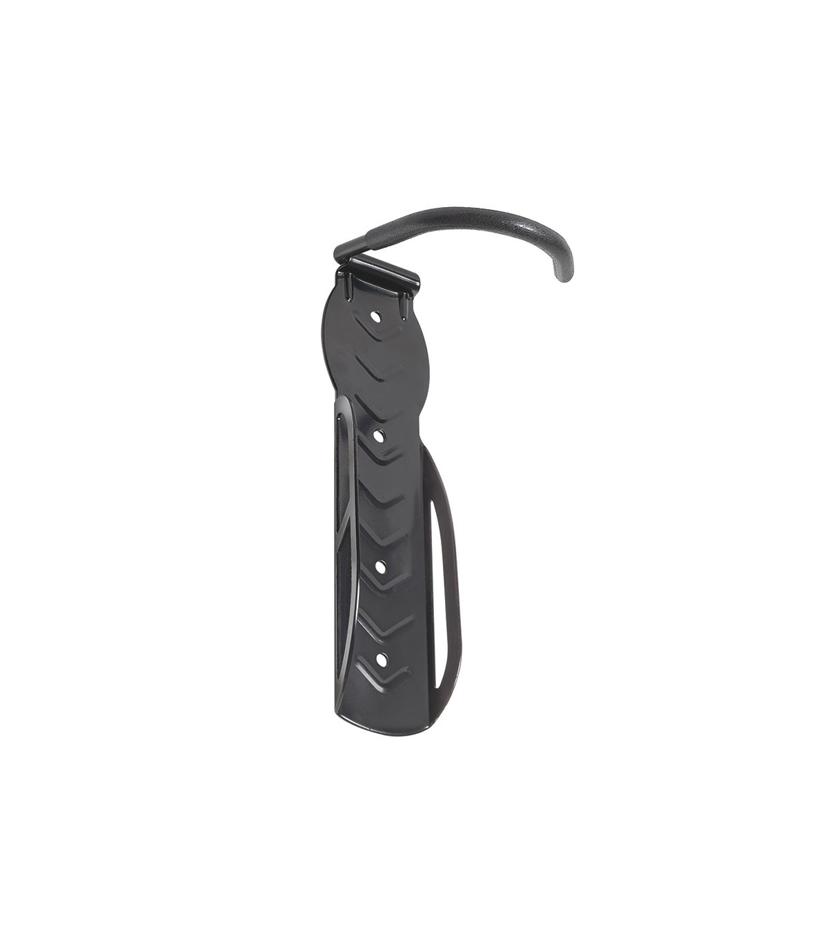 Chapa de acero recubierta. Pintura color negro. Gancho que recoge la rueda recubierto de pvc para evitar rallar. Para alojamiento de cualquier tipo de rueda. Carga máx. 20 Kg. Dimensiones: 12x26 cm.