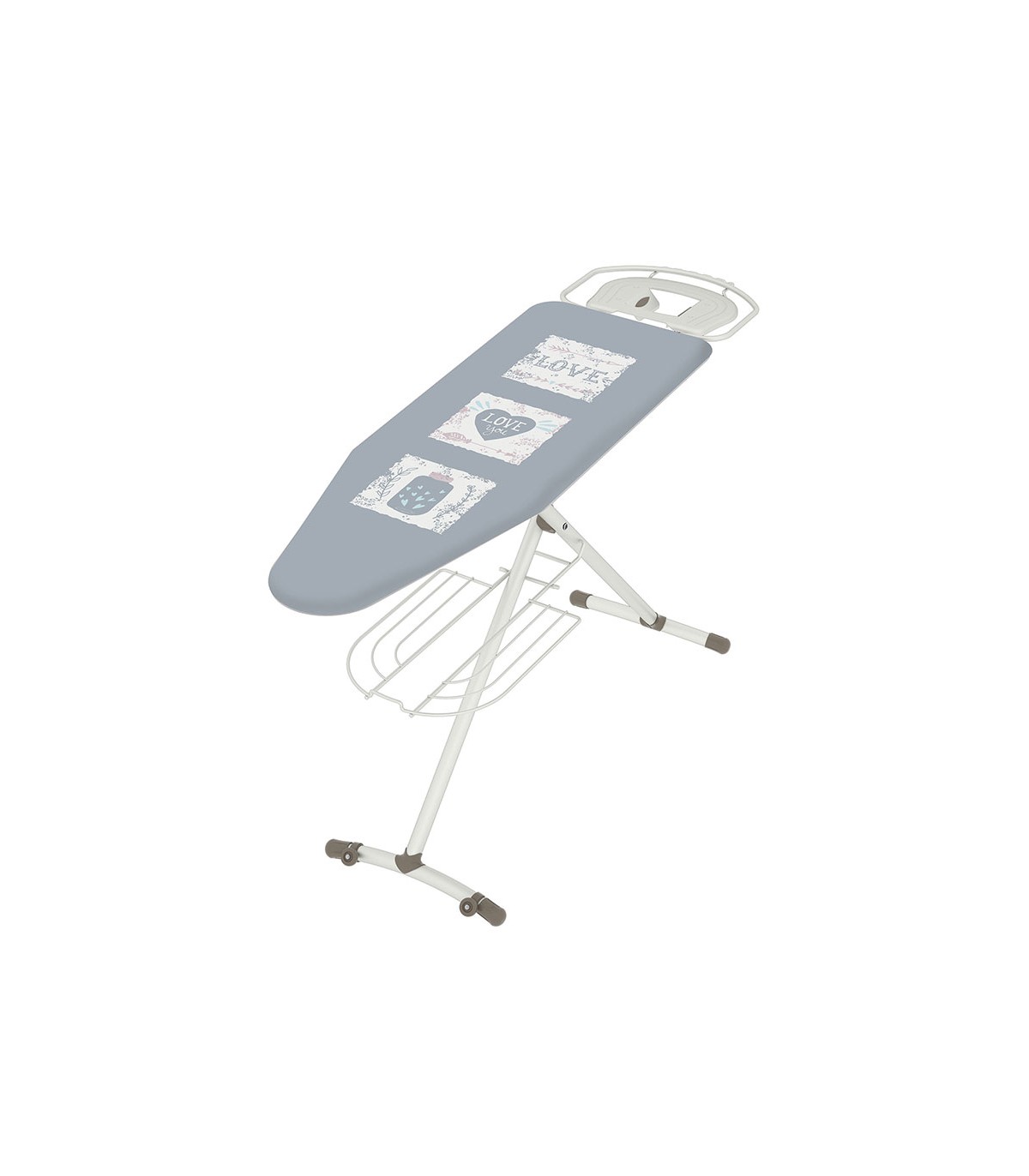 Rejilla metálica. Patas monotubo ø 35 mm. Regulación automática de altura. Reposaplanchas XXL especial centros planchado con inserciones en silicona. Bandeja inferior portarropa. Funda 100% algodón estampado. Pies antideslizantes y ruedas de transporte.