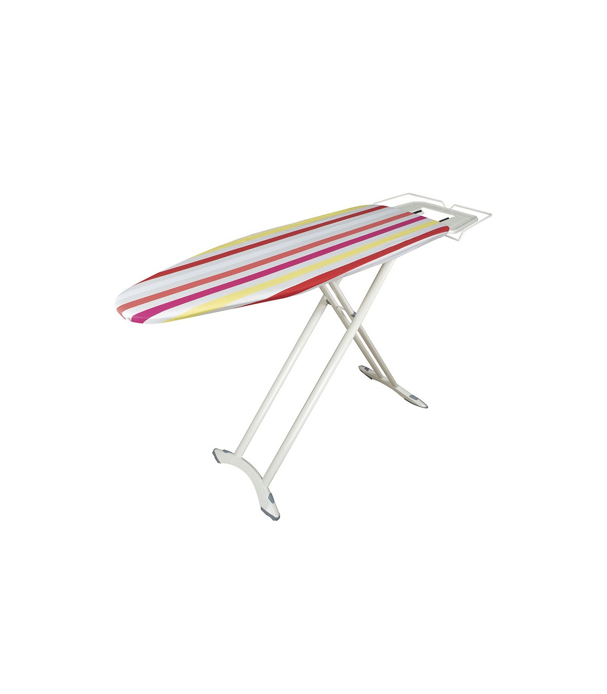Superficie de rejilla. Regulación automática de altura. Gran estabilidad gracias a sus 4 patas de tubo elíptico 40x20 mm. con base antideslizante. Funda 100% algodón estampado acolchado de grosor 5 mm. Reposaplanchas XXL para planchas y centros de planchado.
