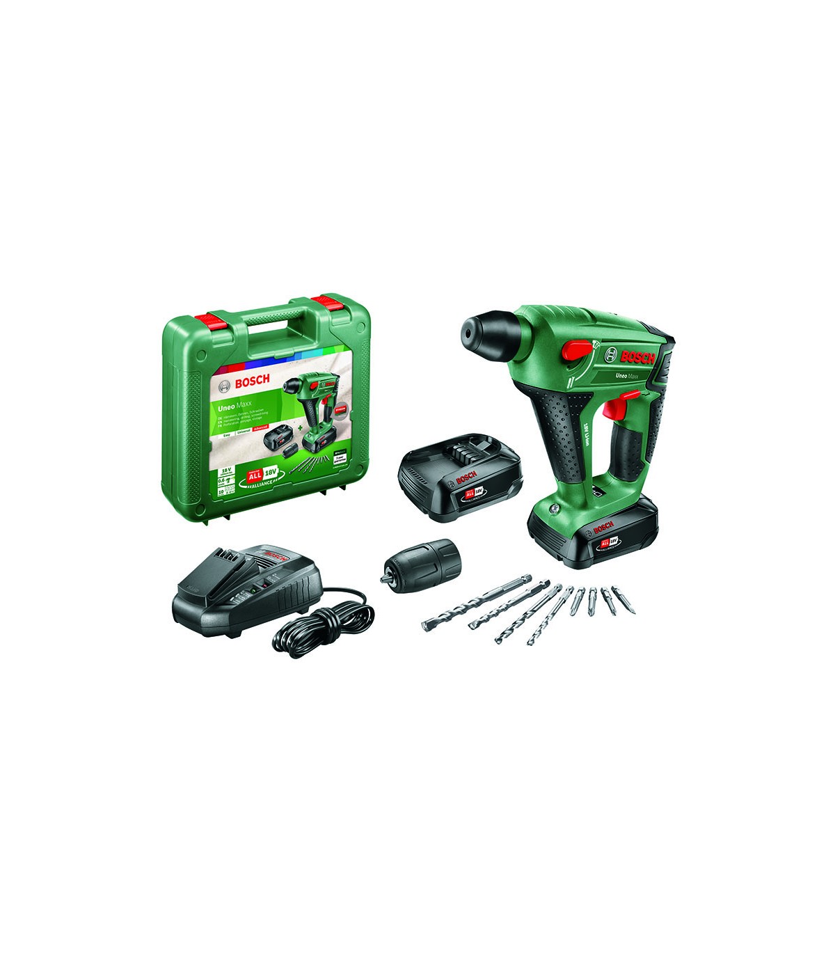 2x Batería 2,5 Ah. Cargador rápido. Portabrocas SDS. Maletín con accesorios.