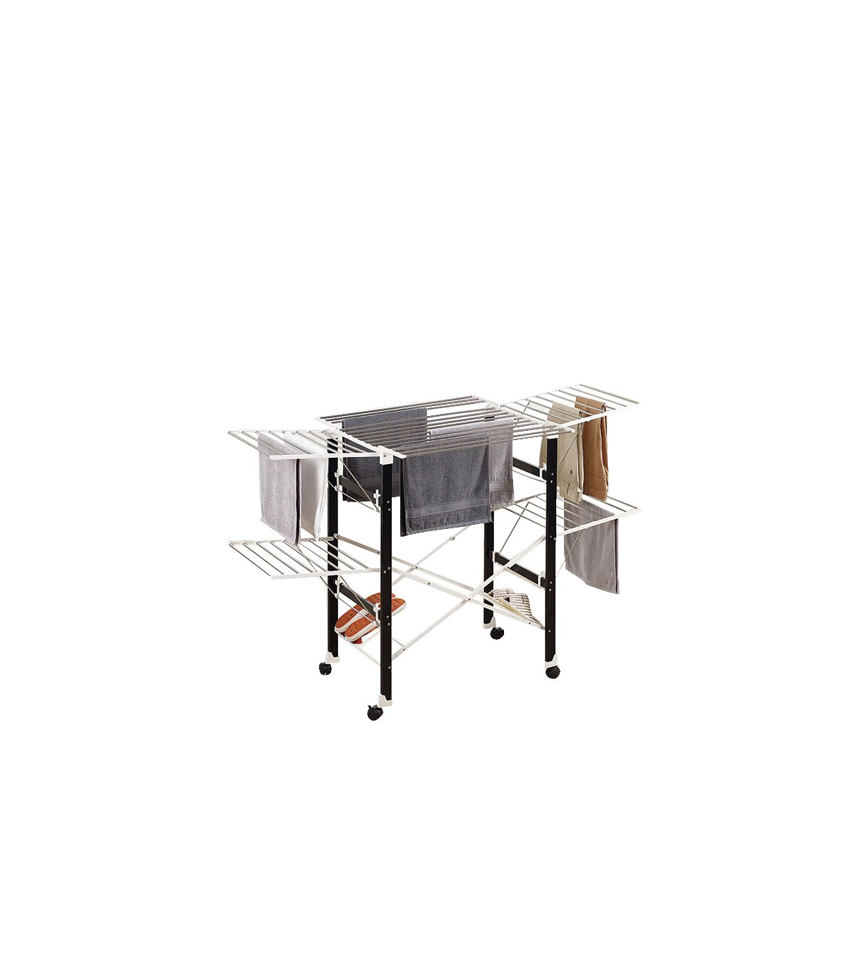 Varillas acero inox con remates ABS. Ruedas de transporte con freno. Diseño compacto para fácil almacenamiento. Ocupa poco espacio plegado. Bicolor blanco/negro.