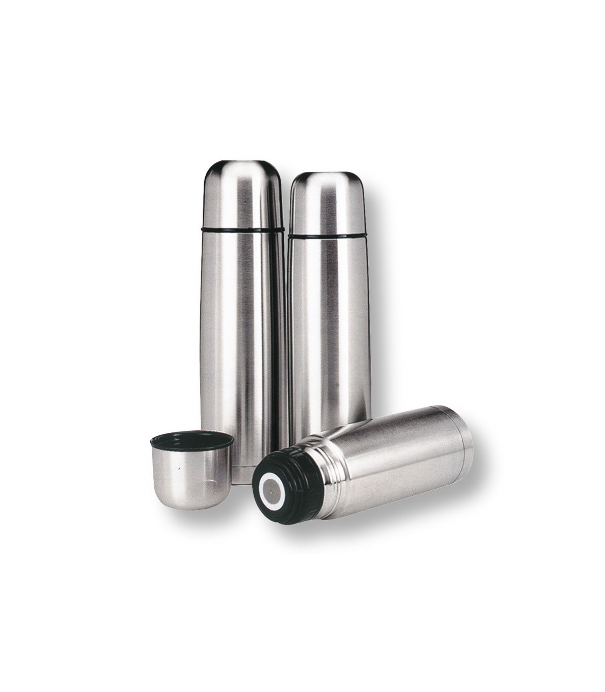 Acero inox alimentario. Doble pared, cámara de vacío. Tapón con pulsador dosificador. Irrompible.