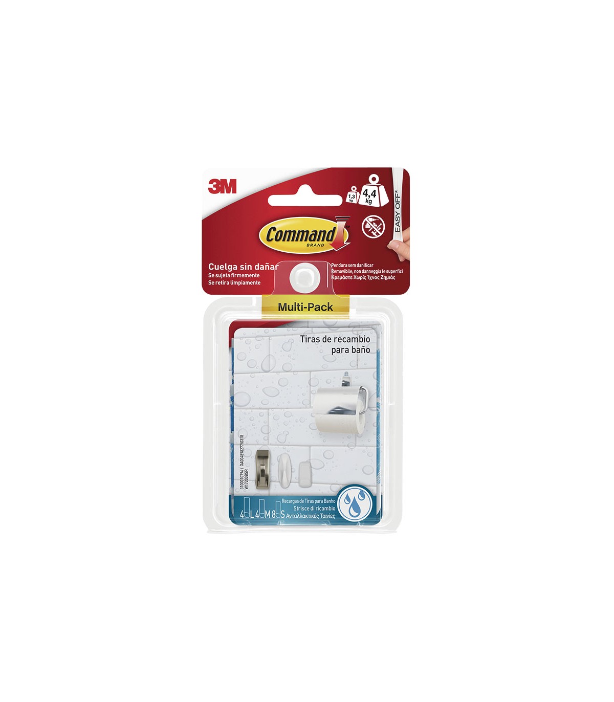 Cintas resistentes al agua. Sin necesidad de hacer agujeros. Se adhieren a multitud de superficies; paredes pintadas, madera, baldosas. Se retiran limpiamente, sin marcas, sin residuos pegajosos, ni manchas. Reutiliza los ganchos usando las tiras de repuesto.