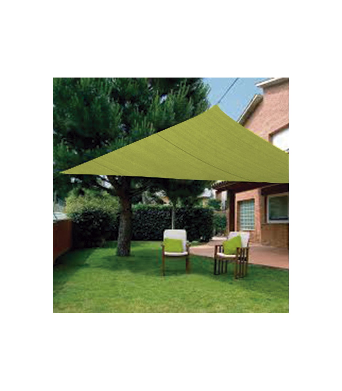 100% poliéster. Doble película de protección PU y antimoho. Anillas de acero inox y cuerdas incluidas. Color verde pistacho.