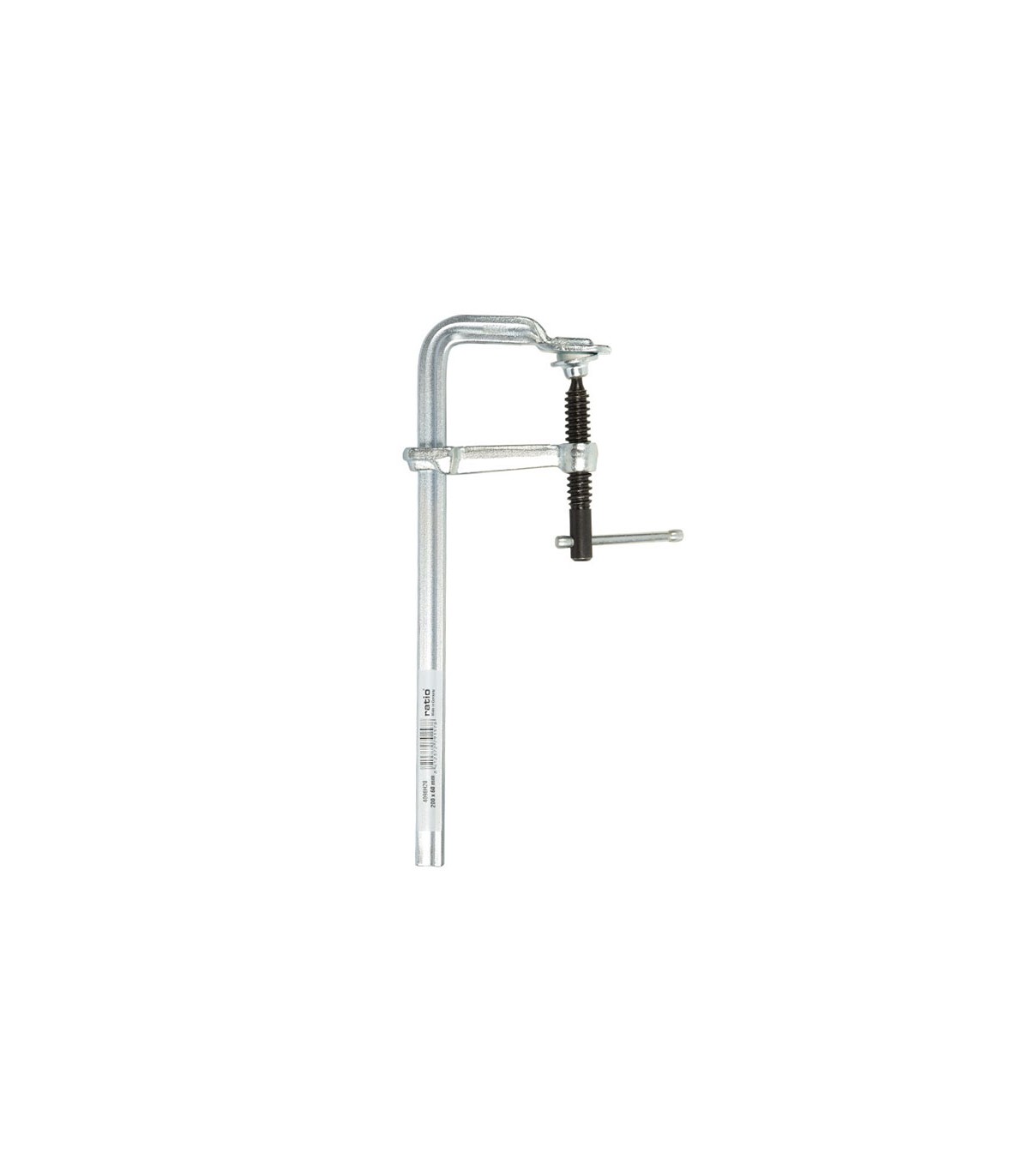 Pasador metálico en cruz. Riel todo acero con formato viga y perfil optimizado. Platillo basculante. Ideal para trabajos que no requieran una fuerza de apriete muy grande.