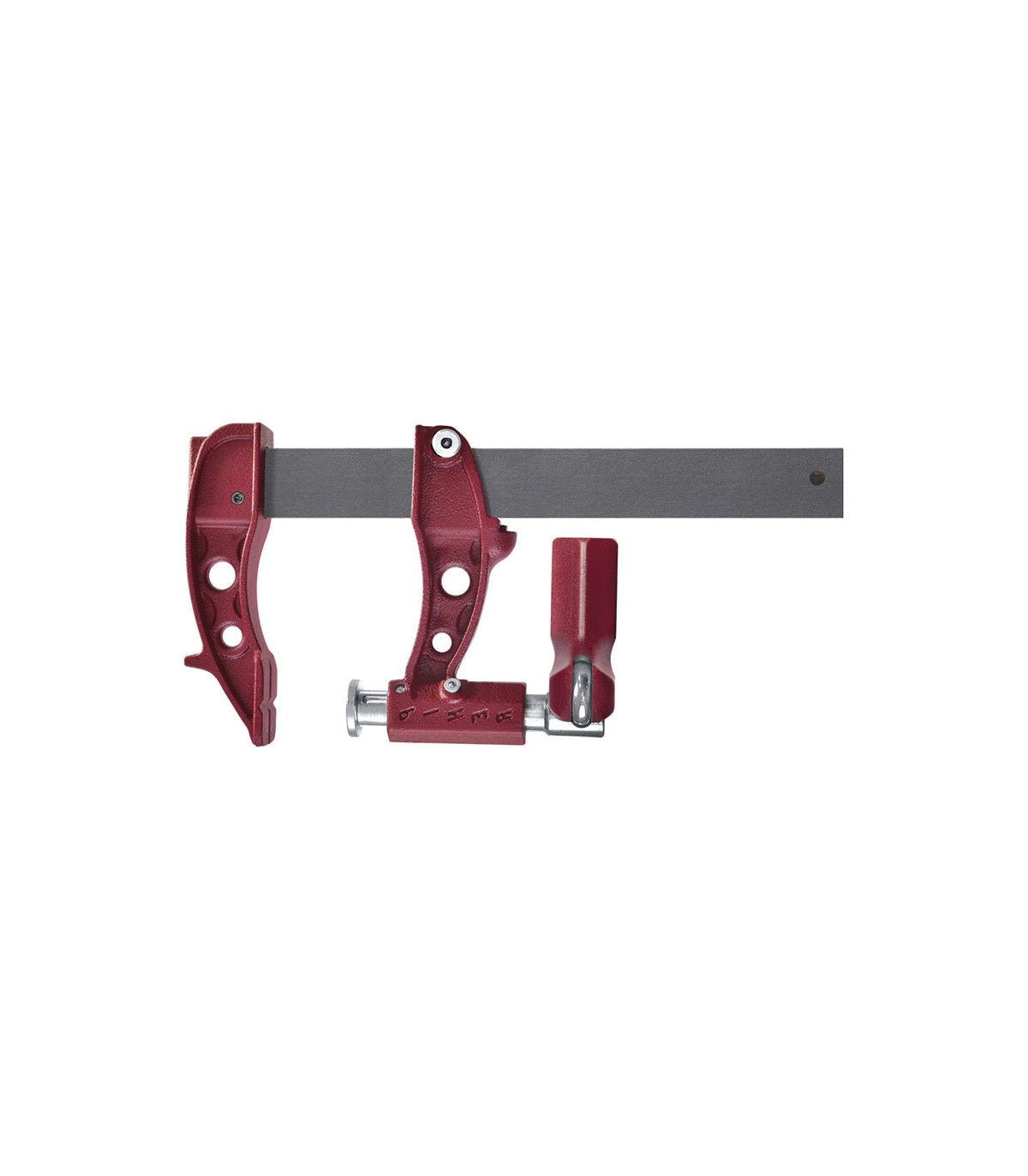 Mango ergonómico multiposición y recambiable. Llanta de acero ballesta calibrada. Cabezales de fundición. Doble sistema de rosca oculta que duplica el avance y la capacidad de presión. Fuerza máxima: 900 kg.