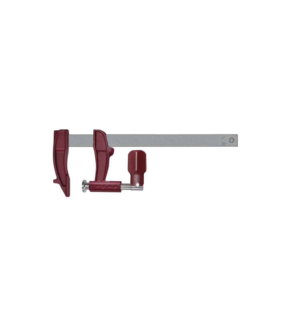 Mango ergonómico abatible e intercambiable. Llanta acero cincado calibrada. Freno antideslizante en cabeza móvil. Émbolo de avance recto con rosca fina y protegida. Superficie de presión con hendidura en V para tubos y perfiles. Fuerza máxima: 400 kg.