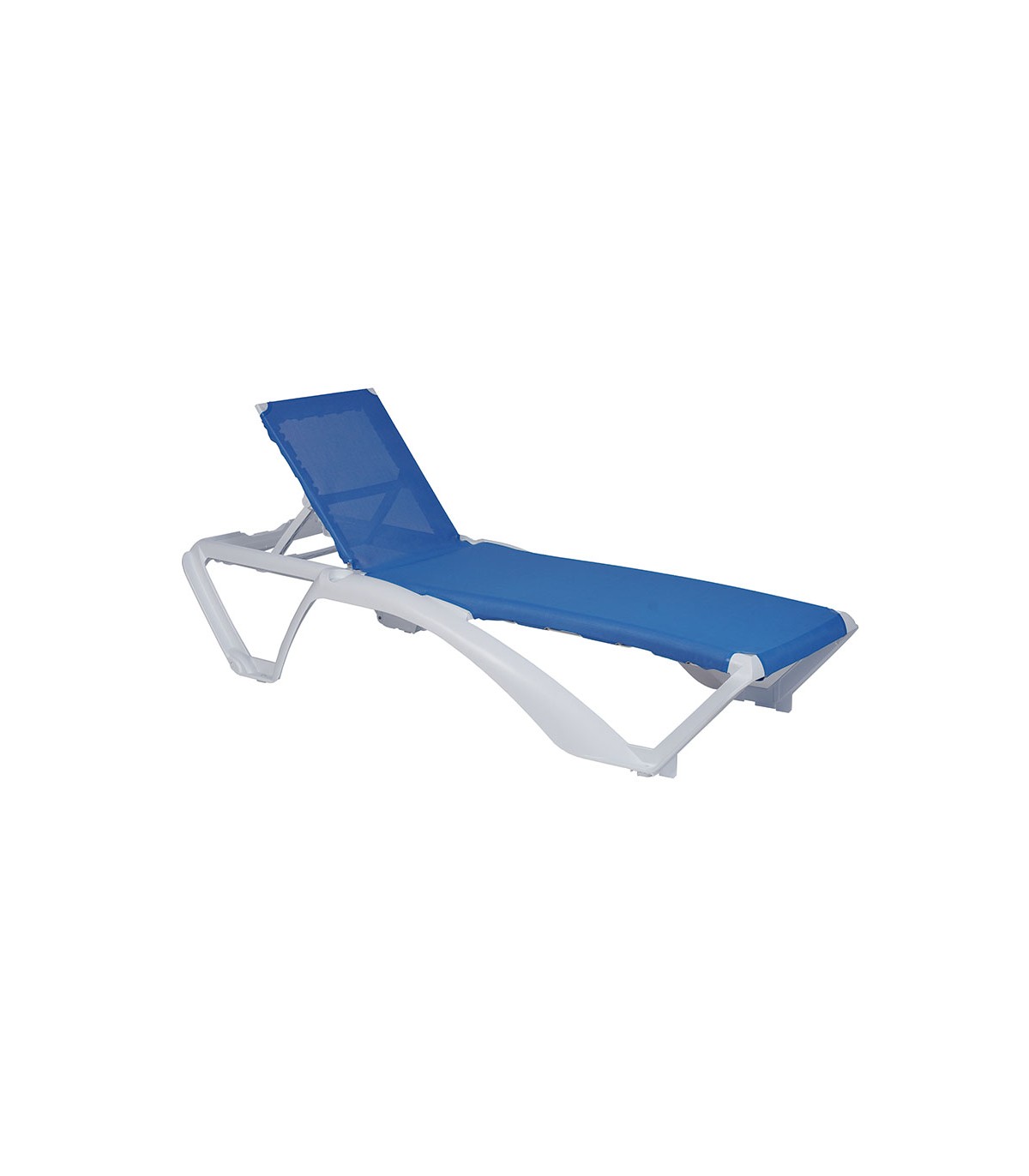 Estructura en polipropileno y fibra de vidrio color blanco. Textilene termosoldado. Ruedas en patas traseras. Incorpora portavasos. Reclicable 4 posiciones. 73x190xh.35 cm. Peso máximo 110 Kg.