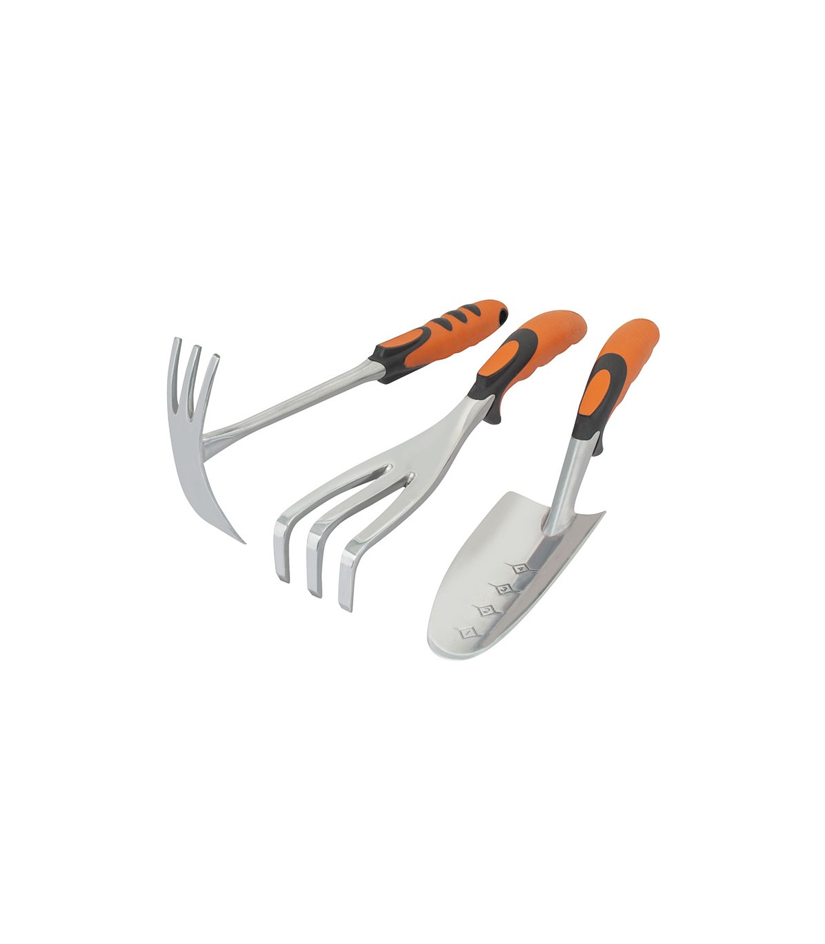 Kit 3 piezas: paleta, azadilla-horquilla y rastrillo. Cuerpo de aluminio fundido y mango bimaterial antideslizante.