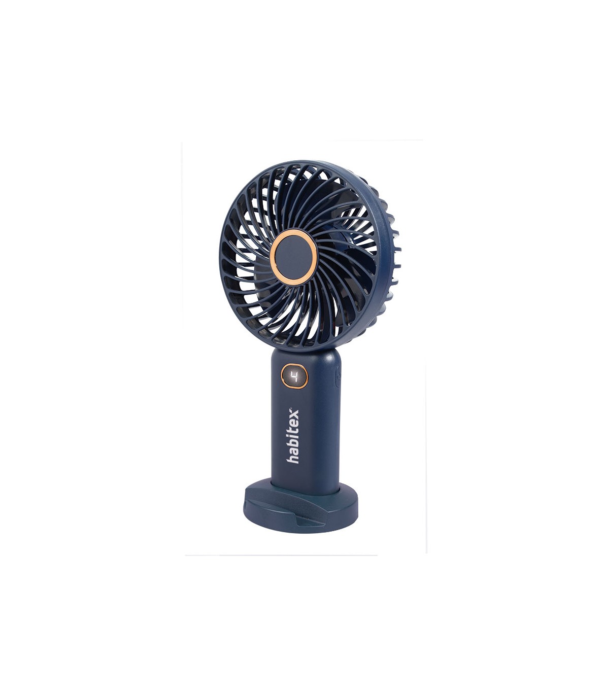4,5 W. 5 velocidades. 3 aspas. Duración máx. potencia: 1 h. Tiempo de carga: 2 h. base 6,8x4,2xh.19,8 cm. Cabezal ø 10,3 cm. USB de mano y de mesa. Plástico ABS varios colores. Pantalla digital con indicador de velocidad. Base con ranura para móvil.