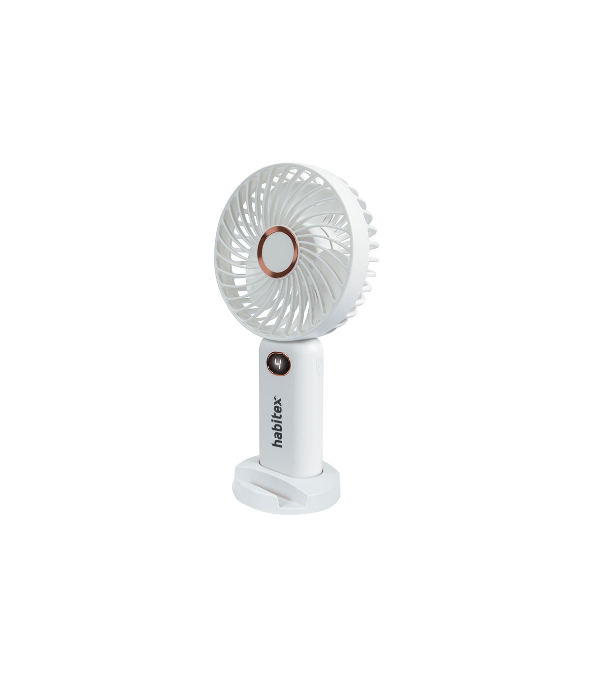 4,5 W. 5 velocidades. 3 aspas. Duración máx. potencia: 1 h. Tiempo de carga: 2 h. base 6,8x4,2xh.19,8 cm. Cabezal ø 10,3 cm. USB de mano y de mesa. Plástico ABS varios colores. Pantalla digital con indicador de velocidad. Base con ranura para móvil.