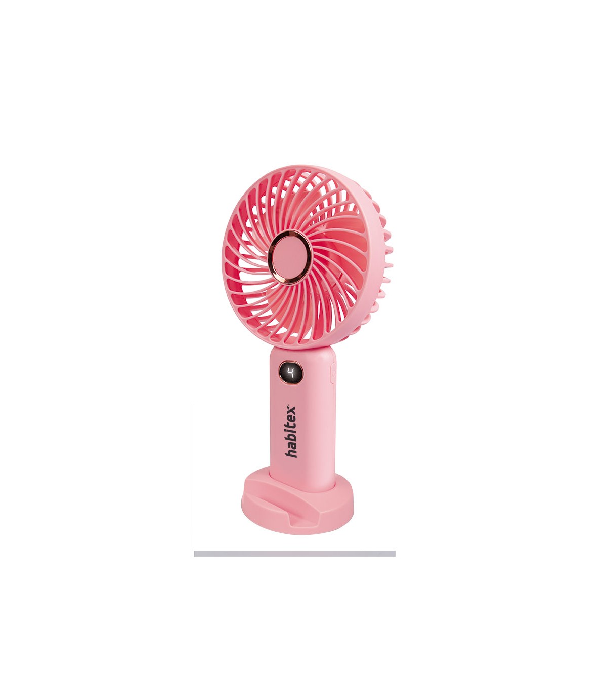 4,5 W. 5 velocidades. 3 aspas. Duración máx. potencia: 1 h. Tiempo de carga: 2 h. base 6,8x4,2xh.19,8 cm. Cabezal ø 10,3 cm. USB de mano y de mesa. Plástico ABS varios colores. Pantalla digital con indicador de velocidad. Base con ranura para móvil.