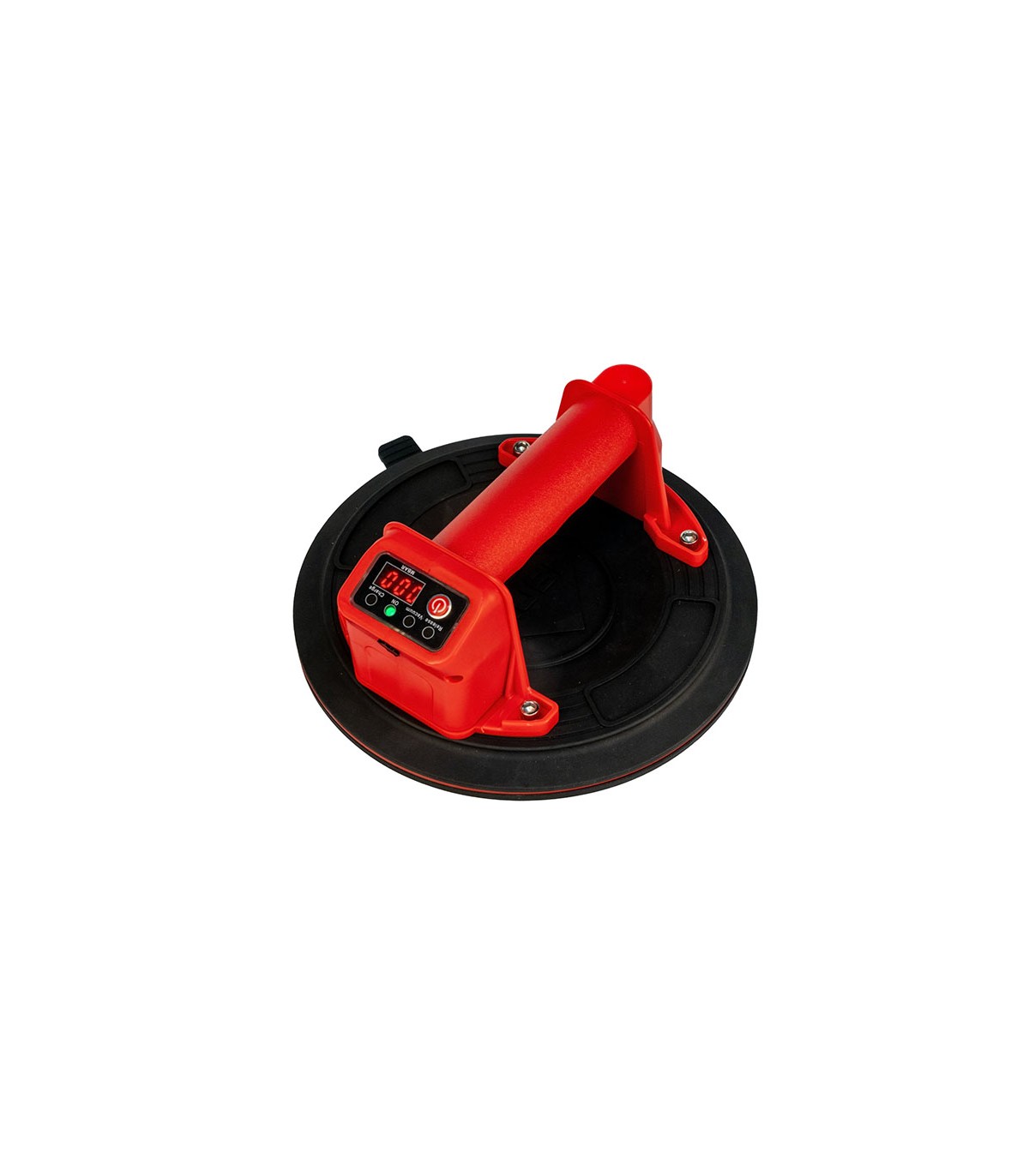 Manipulación de baldosas cerámicas hasta 140 kg. Display con indicador de activación de carga, descarga y estado carga de la batería. Batería de litio recargable 18650, voltaje de 3,7V, intensidad 2 Ah. Con maleta de transporte y cable de UBS tipo C.